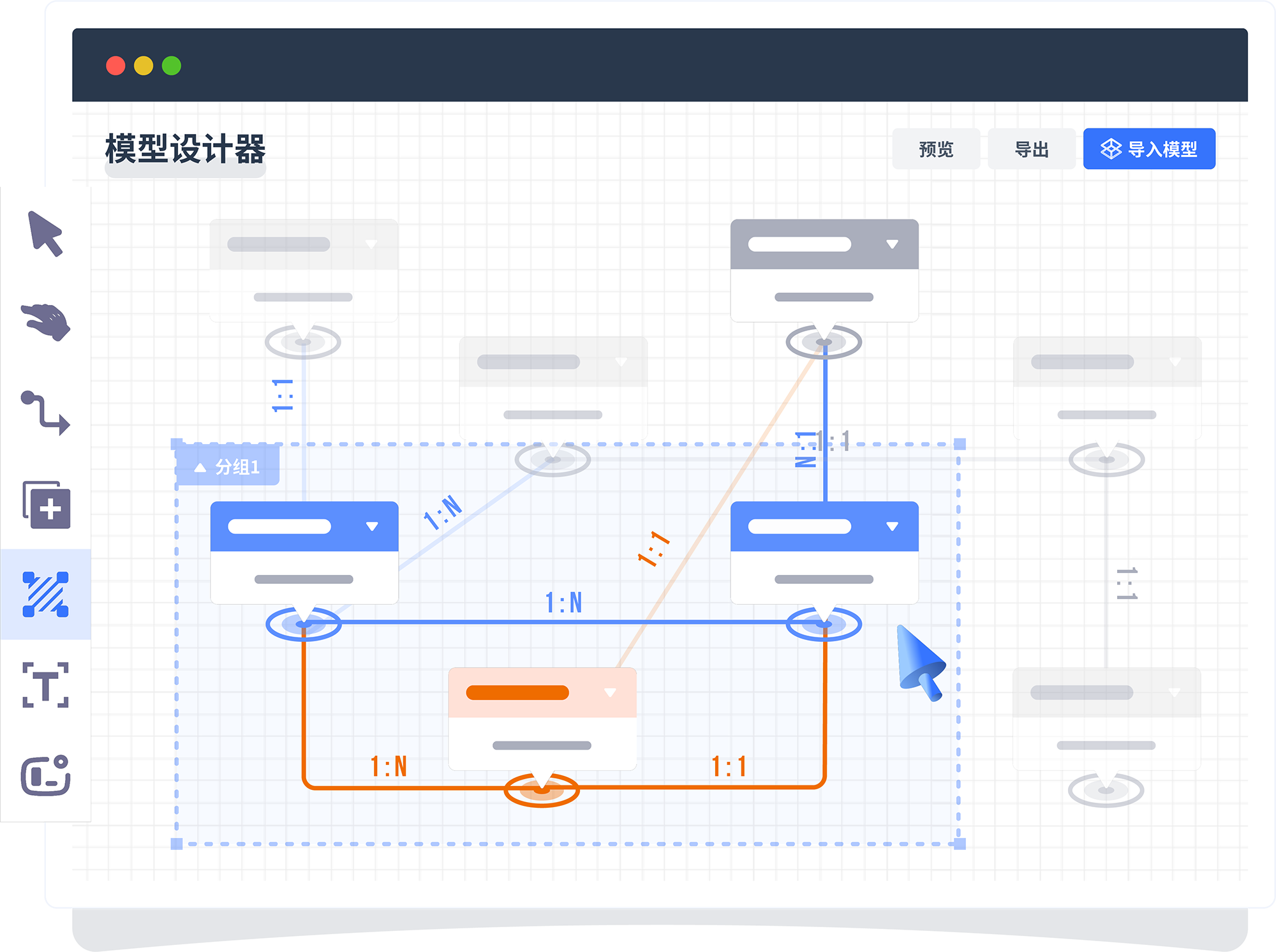 基于用户故事设计业务模型,采用图形化方式完成er图设计,支持多层分组,面向复杂模型也可以条理清晰,模型支持预览、导入、导出。